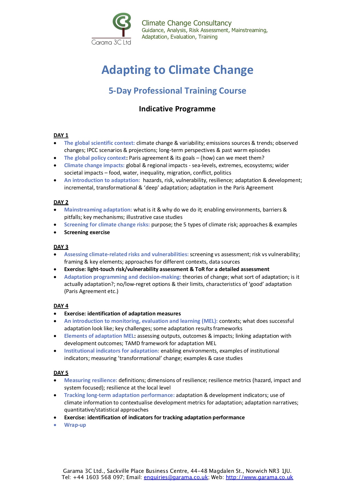 This course combines and updates the content of our previous 3-day course on mainstreaming adaptation and our 2-day course on adaptation M&E, and replaces these courses from 2019. These courses may still be offered if there is sufficient demand. The new course includes additional material on climate change impacts, transformational and ‘deep’ adaptation, institutional and practical aspects of mainstreaming, and resilience and its measurement. The course takes a pragmatic approach to adaptation, mainstreaming and its relation to economic and social development, and highlights some of the challenges and pitfalls of the mainstreaming approach.